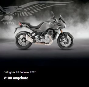 *Von den Aktionsvorteilen können ausschließlich Personen profitieren, die bei einem teilnehmenden PIAGGIO Group Vertragshändler im Aktionszeitraum vom 01. Februar 2026 bis 28. Februar 2026 einen schriftlichen Kaufvertrag über eine neue V100 Mandello Euro 5+ oder V100 Mandello S Euro 5+. Im Aktionszeitraum steht nur eine begrenzte Anzahl von Aktionsfahrzeugen zur Verfügung. Die Aktion gilt solange der Vorrat reicht, und die PIAGGIO Group behält sich die Beendigung der Aktion auch vor dem 28. Februar 2026 vor. Beim Kauf einer V100 Mandello Euro 5+ oder V100 Mandello S Euro 5+ können Kunden von einem Kundenvoreil bis zu 1.500€ profitieren. Den verbindlichen Endpreis der einzelnen Modelle, einschließlich anfallender Nebenkosten, teilt der teilnehmende PIAGGIO Group Vertragshändler mit. Eine Barauszahlung der Aktionsvorteile ist nicht möglich. Sollte der Kunde vom Kaufvertrag zurücktreten, so verfällt auch der Anspruch auf die Aktionsvorteile bzw. diese sind zurückzuerstatten. Die Aktionsvorteile sind nicht mit anderen Aktionen und auch nicht untereinander kombinierbar und werden von der PIAGGIO Group und vom teilnehmenden PIAGGIO Group Vertragshändler getragen.