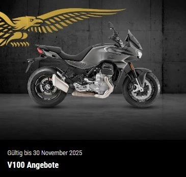 *Von den Aktionsvorteilen können ausschließlich Personen profitieren, die bei einem teilnehmenden PIAGGIO Group Vertragshändler im Aktionszeitraum vom 01. November 2025 bis 30. November 2025 einen schriftlichen Kaufvertrag über eine neue V100 Mandello Euro 5+ oder V100 Mandello S Euro 5+. Im Aktionszeitraum steht nur eine begrenzte Anzahl von Aktionsfahrzeugen zur Verfügung. Die Aktion gilt solange der Vorrat reicht, und die PIAGGIO Group behält sich die Beendigung der Aktion auch vor dem 30. November 2025 vor. Beim Kauf einer V100 Mandello Euro 5+ oder V100 Mandello S Euro 5+ können Kunden von einem Kundenvoreil bis zu 1.500€ profitieren. Den verbindlichen Endpreis der einzelnen Modelle, einschließlich anfallender Nebenkosten, teilt der teilnehmende PIAGGIO Group Vertragshändler mit. Eine Barauszahlung der Aktionsvorteile ist nicht möglich. Sollte der Kunde vom Kaufvertrag zurücktreten, so verfällt auch der Anspruch auf die Aktionsvorteile bzw. diese sind zurückzuerstatten. Die Aktionsvorteile sind nicht mit anderen Aktionen und auch nicht untereinander kombinierbar und werden von der PIAGGIO Group und vom teilnehmenden PIAGGIO Group Vertragshändler getragen.