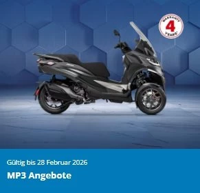 *Von den Aktionsvorteilen können ausschließlich Personen profitieren, die bei einem teilnehmenden PIAGGIO Group Vertragshändler im Aktionszeitraum vom 01. Januar 2026 bis 31. Januar 2026 einen schriftlichen Kaufvertrag über einen neuen MP3 310 Euro 5+, MP3 310 S Euro 5+, MP3 400 Euro 5+, MP3 400 S Euro 5+ oder MP3 Exclusive 530 Euro 5+. Im Aktionszeitraum steht nur eine begrenzte Anzahl von Aktionsfahrzeugen zur Verfügung. Die Aktion gilt solange der Vorrat reicht, und die PIAGGIO Group behält sich die Beendigung der Aktion auch vor dem 31. Januar 2026 vor. Beim Kauf eines MP3 310 Euro 5+, MP3 310 S Euro 5+, MP3 400 Euro 5+, MP3 400 S Euro 5+ oder MP3 Exclusive 530 Euro 5+ können Kunden von einem Top Case und einem Windschild profitieren. Den verbindlichen Endpreis der einzelnen Modelle, einschließlich anfallender Nebenkosten, teilt der teilnehmende PIAGGIO Group Vertragshändler mit. Eine Barauszahlung der Aktionsvorteile ist nicht möglich. Sollte der Kunde vom Kaufvertrag zurücktreten, so verfällt auch der Anspruch auf die Aktionsvorteile bzw. diese sind zurückzuerstatten. Die Aktionsvorteile sind nicht mit anderen Aktionen und auch nicht untereinander kombinierbar und werden von der PIAGGIO Group und vom teilnehmenden PIAGGIO Group Vertragshändler getragen.