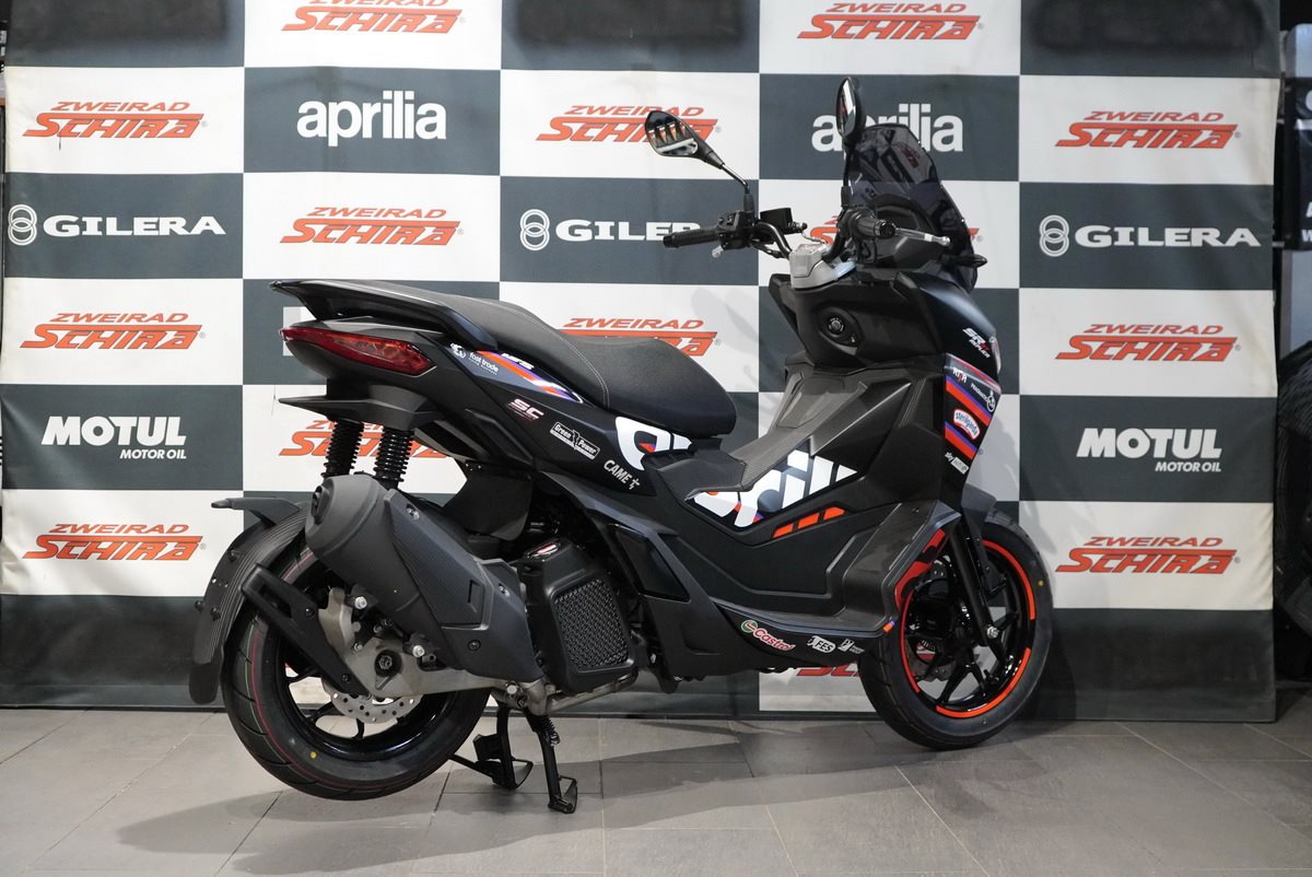 Die Sonderedition Replica zeigt stolz ihre vom Rennsport inspirierten Referenzen. Mit seiner auffälligen Optik, die sich durch eine mattschwarze Verkleidung mit roten und violetten Grafikelementen auszeichnet, macht der SR GT keinen Hehl daraus, dass er von der RS-GP25 inspiriert ist. Der Soziusgriff und der Spoiler sind ebenfalls in Mattschwarz gehalten, während das ikonische Aprilia Logo an der Seite prangt.