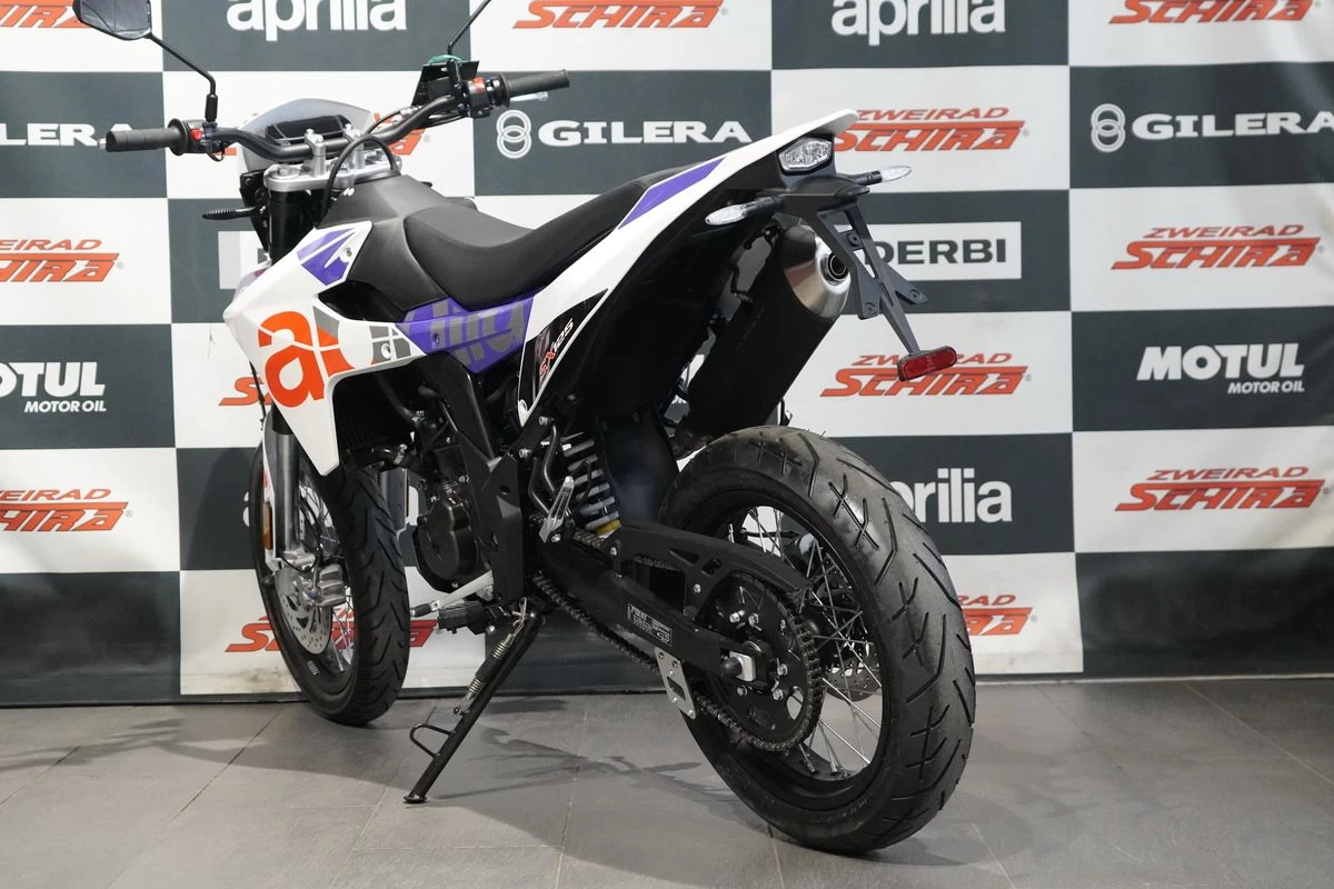 Die SX 125 ist leicht und präzise in der Handhabung und wird von einem modernen Einzylinder-Motor mit vier Ventilen und Euro 5+ Norm angetrieben, der über alle Drehzahlbereiche hinweg ein hervorragendes Drehmoment und eine hervorragende Leistung bietet. Präzision und Sicherheit in Kurven werden durch eine Dämpfung mit langem Federweg und ein Bosch-ABS mit Anti-Überschlag-Funktion gewährleistet, das beim Bremsen auf das Vorderrad einwirkt, um das Anheben des Hinterrads zu regulieren. Das Bremssystem verfügt über zwei schwimmend gelagerte Bremssättel: Der vordere mit zwei Kolben greift auf eine 300 mm Scheibe zu, während der hintere auf eine 218 mm Scheibe wirkt.