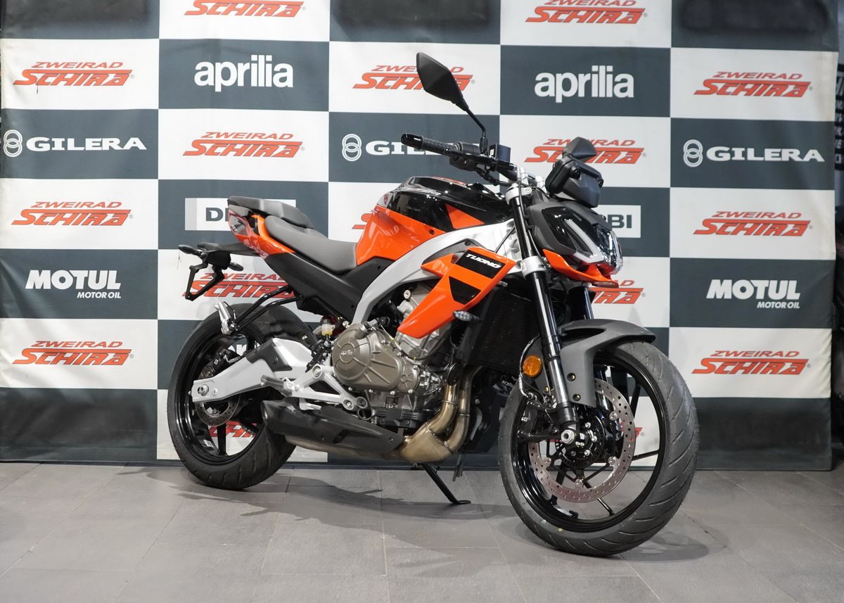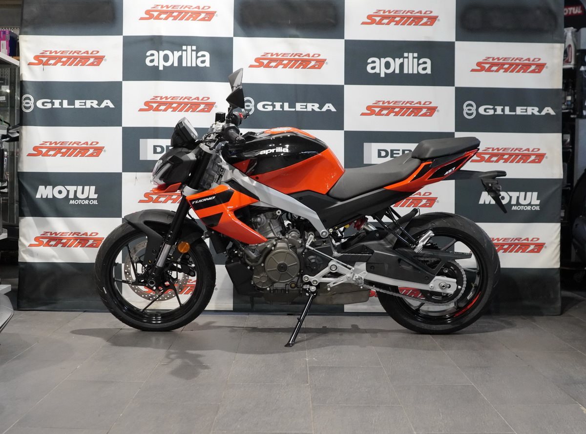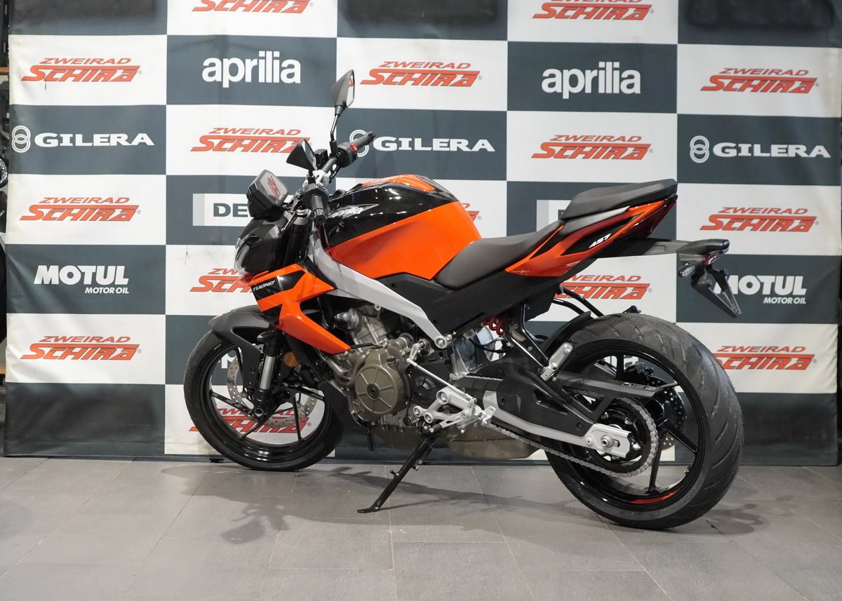 Die Aprilia Tuono 457 wird von einem modernen 457 cm3 Zweizylindermotor mit tragender Funktion angetrieben - ein echtes Technologiejuwel aus dem Hause Aprilia, bewusst offen sichtbar gelassen. Das hochmoderne, flüssigkeitsgekühlte Triebwerk liefert eine maximale Leistung von 35 kW (47,6 PS) bei 9.400 U/min - das Maximum, das mit A2-Führerschein gefahren werden darf. Rekordverdächtige Performance für einen Parallel-Twin dieser Hubraumklasse, unterstützt durch Premium-Elektronik mit Ride-by-Wire und drei Riding Modes (ECO, SPORT und RAIN), die Leistung, Drehmoment und Traktionskontrolle optimieren - letztere ist sogar während der Fahrt in drei Stufen einstellbar.