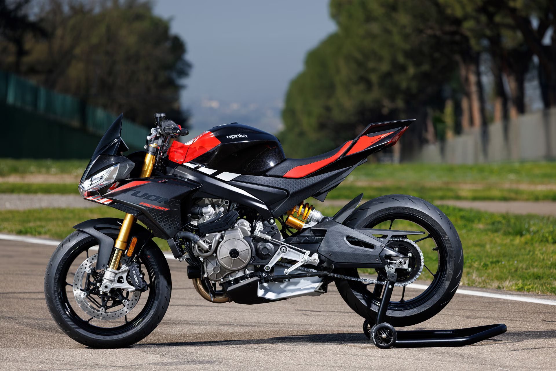 Dank ihres Zweizylindermotors, der Euro 5+ zertifiziert ist, kann die Tuono 660 Factory bis zu 105 PS bei 10.400 U/min und ein Spitzendrehmoment von 70 Nm bei 8.400 U/min entfalten. Eine dynamische und explosive Leistungsabgabe, die dank der Brembo Bremsen und des fortschrittlichen Öhlins Fahrwerks dennoch eine flüssige Fahrt ermöglicht. Diese bieten die Gabel der NIX 30 Serie mit 43 mm Standrohren, während das STX 46 Federbein über einen integrierten Ausgleichsbehälter verfügt. Beide Einheiten sind hydraulisch in Zug- und Druckstufe sowie in der Federvorspannung einstellbar. Einmal im Sitz, gibt es keine Ausreden mehr, nur Leistung, um auf jeder Straße und in jeder Kurve das Beste zu geben.