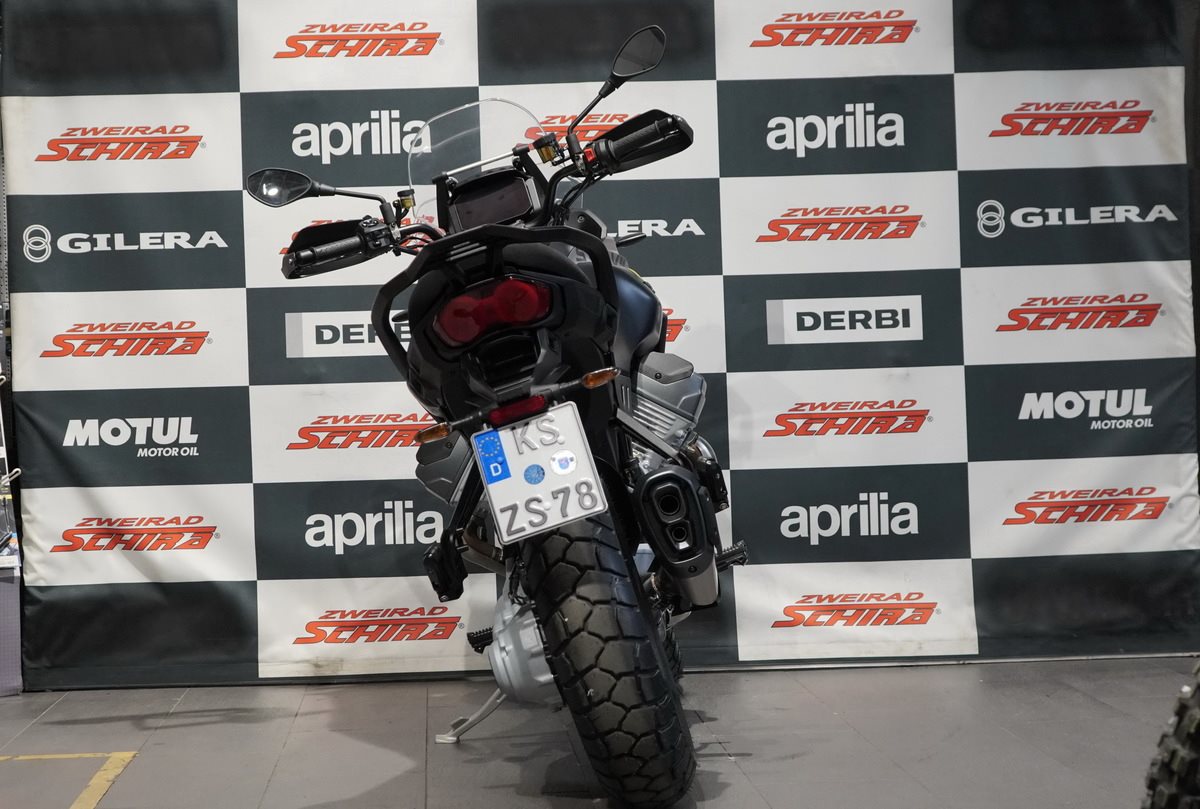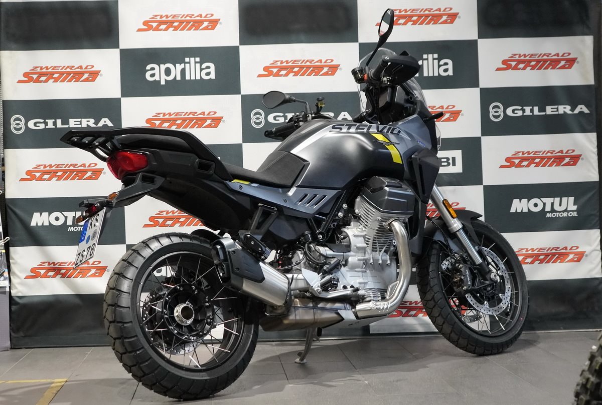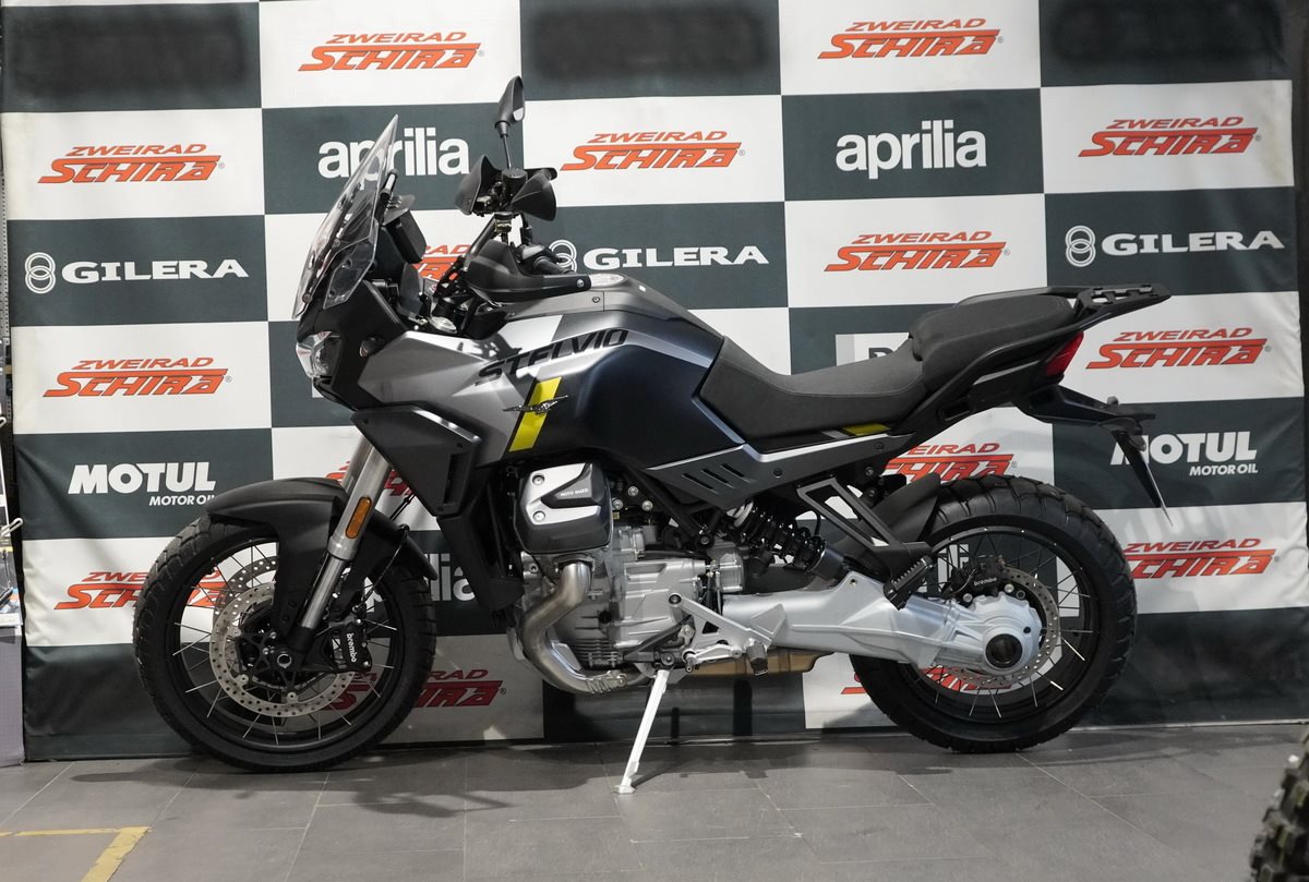 Stelvio wurde entwickelt, um Ihnen zu ermöglichen, das Beste aus jeder Fahrt zu machen und Ihren Horizont ohne Grenzen zu erweitern, dank seines 21-Liter-Tanks mit einer Reichweite von über 400 km. Sein Herzstück ist der Stahlrohrrahmen, der das Handling des Motorrads erleichtert und einen optimalen Kompromiss zwischen Agilität und Stabilität bietet.