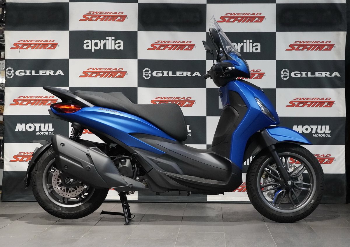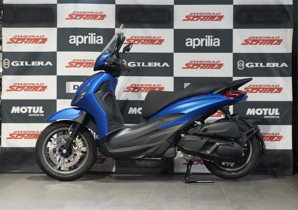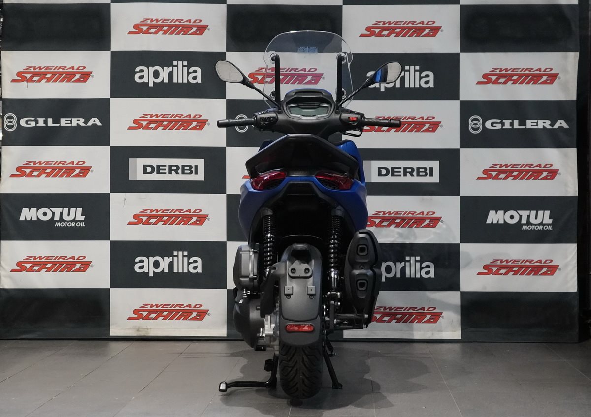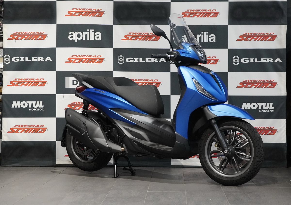 Der Piaggio Beverly S zeichnet sich durch seinen sportlichen Charakter aus. Die matte Graphit-Finish hebt Details wie die Felgen, den hinteren Haltegriff sowie die Einfassungen des Cockpits und des LED-Frontscheinwerfers hervor. Blaue Akzente an dem S im Logo, am Vorderrad und an der Frontkrawatte unterstreichen seinen kraftvollen Stil. Die markante Front mit der V-förmigen Lüftungsöffnung und dem wabenförmigen Kühlergrill sowie das schlanke Heck und die zweifarbigen Nähte der Sitzbank vervollständigen das Design. Sie schaffen eine perfekte Verbindung zwischen einem sportlichen Großradroller und einem kraftvollen Grand Tourer.