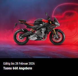 *Von den Aktionsvorteilen können ausschließlich Personen profitieren, die bei einem teilnehmenden PIAGGIO Group Vertragshändler im Aktionszeitraum vom 01. Februar 2026 bis 28. Februar 2026 einen schriftlichen Kaufvertrag über eine neue Tuono 660 Factory Euro 5+ abgeschlossen haben. Im Aktionszeitraum steht nur eine begrenzte Anzahl von Aktionsfahrzeugen zur Verfügung. Die Aktion gilt solange der Vorrat reicht, und die PIAGGIO Group behält sich die Beendigung der Aktion auch vor dem 28. Februar 2026 vor. Beim Kauf einer Tuono 660 Factory E5+ können Kunden von einem Kundenvorteil in Höhe von 500,00 Euro profitieren. Den verbindlichen Endpreis der einzelnen Modelle, einschließlich anfallender Nebenkosten, teilt der teilnehmende PIAGGIO Group Vertragshändler mit. Eine Barauszahlung der Aktionsvorteile ist nicht möglich. Sollte der Kunde vom Kaufvertrag zurücktreten, so verfällt auch der Anspruch auf die Aktionsvorteile bzw. diese sind zurückzuerstatten. Die Aktionsvorteile sind nicht mit anderen Aktionen und auch nicht untereinander kombinierbar und werden von der PIAGGIO Group und vom teilnehmenden PIAGGIO Group Vertragshändler getragen.