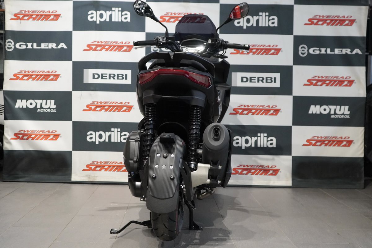 Die Sonderedition Replica zeigt stolz ihre vom Rennsport inspirierten Referenzen. Mit seiner auffälligen Optik, die sich durch eine mattschwarze Verkleidung mit roten und violetten Grafikelementen auszeichnet, macht der SR GT keinen Hehl daraus, dass er von der RS-GP25 inspiriert ist. Der Soziusgriff und der Spoiler sind ebenfalls in Mattschwarz gehalten, während das ikonische Aprilia Logo an der Seite prangt.