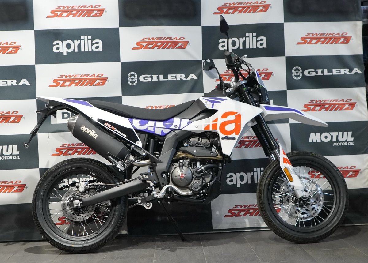Die SX 125 ist leicht und präzise in der Handhabung und wird von einem modernen Einzylinder-Motor mit vier Ventilen und Euro 5+ Norm angetrieben, der über alle Drehzahlbereiche hinweg ein hervorragendes Drehmoment und eine hervorragende Leistung bietet. Präzision und Sicherheit in Kurven werden durch eine Dämpfung mit langem Federweg und ein Bosch-ABS mit Anti-Überschlag-Funktion gewährleistet, das beim Bremsen auf das Vorderrad einwirkt, um das Anheben des Hinterrads zu regulieren. Das Bremssystem verfügt über zwei schwimmend gelagerte Bremssättel: Der vordere mit zwei Kolben greift auf eine 300 mm Scheibe zu, während der hintere auf eine 218 mm Scheibe wirkt.