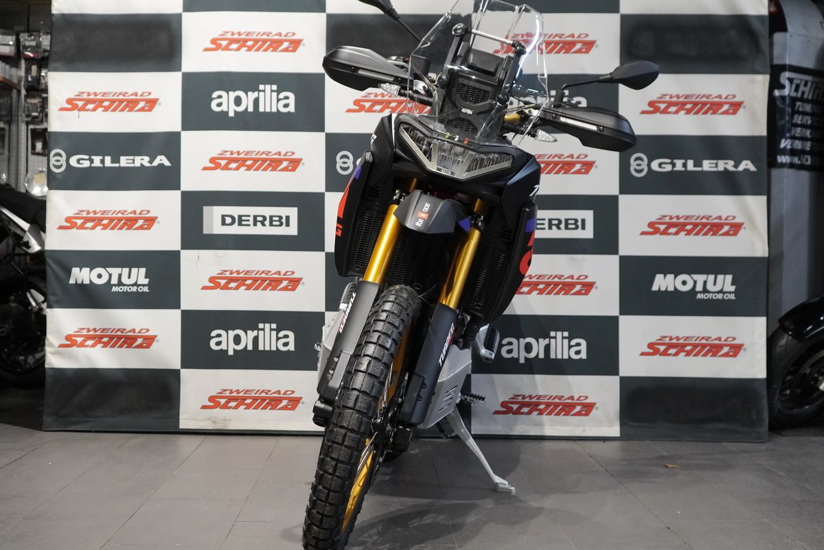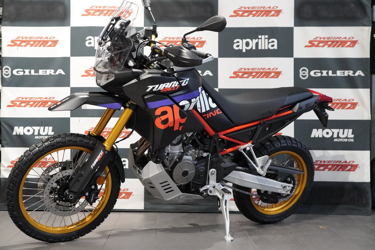 Die Aprilia Tuareg Rally ist in demselben unverwechselbaren Rally Race Replica -Look erhältlich, der auch das Motorrad von Jacopo Cerutti geziert hat, als er im Januar 2024 die legendäre Dakar-Ziellinie als Erster überquerte. Die Gabel, die Felgen und der Lenker sind in sportlichem Gold eloxiert. Die Kettenführung, der extrem robuste Motorschutz aus Aluminium, die verstärkten Handprotektoren und der neue hohe vordere Fender unterstreichen den kompromisslosen Offroad-Charakter dieses Motorrads. Der höhere Sitz und der erhöhte Lenker bieten auf besonders extremen Strecken eine bessere Kontrolle beim Fahren im Stehen.