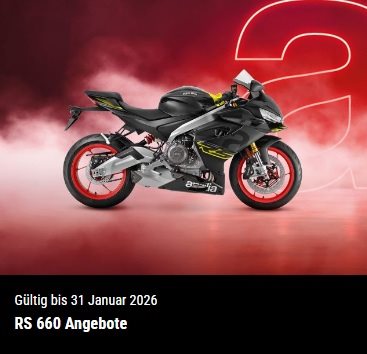 *Von den Aktionsvorteilen können ausschließlich Personen profitieren, die bei einem teilnehmenden PIAGGIO Group Vertragshändler im Aktionszeitraum vom 01. Januar 2026 bis 31. Januar 2026 einen schriftlichen Kaufvertrag über eine neue RS 660 Euro 5+ oder RS 660 Factory Euro 5+ abgeschlossen haben. Im Aktionszeitraum steht nur eine begrenzte Anzahl von Aktionsfahrzeugen zur Verfügung. Die Aktion gilt solange der Vorrat reicht, und die PIAGGIO Group behält sich die Beendigung der Aktion auch vor dem 31. Januar 2026 vor. Beim Kauf einer RS 660 Euro 5+ oder RS 660 Factory Euro 5+ können Kunden von einem Kundenvorteil in Höhe von 500,00 Euro profitieren. Den verbindlichen Endpreis der einzelnen Modelle, einschließlich anfallender Nebenkosten, teilt der teilnehmende PIAGGIO Group Vertragshändler mit. Eine Barauszahlung der Aktionsvorteile ist nicht möglich. Sollte der Kunde vom Kaufvertrag zurücktreten, so verfällt auch der Anspruch auf die Aktionsvorteile bzw. diese sind zurückzuerstatten. Die Aktionsvorteile sind nicht mit anderen Aktionen und auch nicht untereinander kombinierbar und werden von der PIAGGIO Group und vom teilnehmenden PIAGGIO Group Vertragshändler getragen.