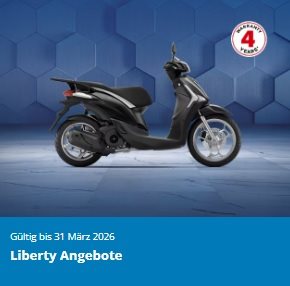 *Von den Aktionsvorteilen können ausschließlich Personen profitieren, die bei einem teilnehmenden PIAGGIO Group Vertragshändler im Aktionszeitraum vom 01. März 2026 bis 31. März 2026 einen schriftlichen Kaufvertrag über einen neuen Liberty 125 Euro 5+ oder Liberty 125 S Euro 5+. Im Aktionszeitraum steht nur eine begrenzte Anzahl von Aktionsfahrzeugen zur Verfügung. Die Aktion gilt solange der Vorrat reicht, und die PIAGGIO Group behält sich die Beendigung der Aktion auch vor dem 31. März 2026 vor. Beim Kauf eines Liberty 125 Euro 5+ oder Liberty 125 S Euro 5+ können Kunden von einem kostenlosen Top Case inklusive Abdeckung im Wert von 168,00 Euro profitieren. Den verbindlichen Endpreis der einzelnen Modelle, einschließlich anfallender Nebenkosten, teilt der teilnehmende PIAGGIO Group Vertragshändler mit. Eine Barauszahlung der Aktionsvorteile ist nicht möglich. Sollte der Kunde vom Kaufvertrag zurücktreten, so verfällt auch der Anspruch auf die Aktionsvorteile bzw. diese sind zurückzuerstatten. Die Aktionsvorteile sind nicht mit anderen Aktionen und auch nicht untereinander kombinierbar und werden von der PIAGGIO Group und vom teilnehmenden PIAGGIO Group Vertragshändler getragen.