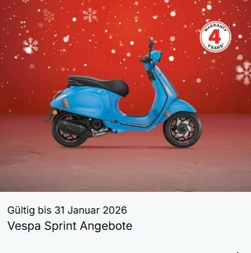 *Von den Aktionsvorteilen können ausschließlich Personen profitieren, die bei einem teilnehmenden PIAGGIO Group Vertragshändler im Aktionszeitraum vom 01. Januar 2026 bis 31. Januar 2026 einen schriftlichen Kaufvertrag über eine neue Primavera 50 (MJ 2024/2025), Primavera 125 (MJ 2024/2025), Sprint S 50 (MJ 2024/2025) oder Sprint S 125 (MJ 2024/2025) abgeschlossen haben. Im Aktionszeitraum steht nur eine begrenzte Anzahl von Aktionsfahrzeugen zur Verfügung. Die Aktion gilt solange der Vorrat reicht, und die PIAGGIO Group behält sich die Beendigung der Aktion auch vor dem 31. Januar 2026 vor. Beim Kauf einer Primavera 50 (MJ 2024/2025), Primavera 125 (MJ 2024/2025), Sprint S 50 (MJ 2024/2025) oder Sprint S 125 (MJ 2024/2025) können Kunden von Aktionsvorteilen in Form von Zubehör (Vespa Top Case + Vespa Top Case Träger + Vespa Jethelm) im Wert von 607,00 € profitieren. Den verbindlichen Endpreis der einzelnen Modelle, einschließlich anfallender Nebenkosten, teilt der teilnehmende PIAGGIO Group Vertragshändler mit. Eine Barauszahlung der Aktionsvorteile ist nicht möglich. Sollte der Kunde vom Kaufvertrag zurücktreten, so verfällt auch der Anspruch auf die Aktionsvorteile bzw. diese sind zurückzuerstatten. Die Aktionsvorteile sind nicht mit anderen Aktionen und auch nicht untereinander kombinierbar und werden von der PIAGGIO Group und vom teilnehmenden PIAGGIO Group Vertragshändler getragen.